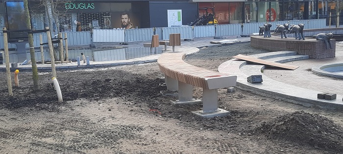 Grijsen vond het een heerlijke opdracht. “Dat podium was uniek, dat hebben we niet ergens anders staan.” Maatwerk, maar niet het meest uitdagende deel, dat was het inpassen van de achttien meter brede bank in de natuurstenen zitrand om het plantvak op het Jumboplein. “Dat luistert zo nauw. Zo’n podium maak je in de fabriek, die bank die moet worden ingepast en dat vereist heel veel afstemming ter plekke.”