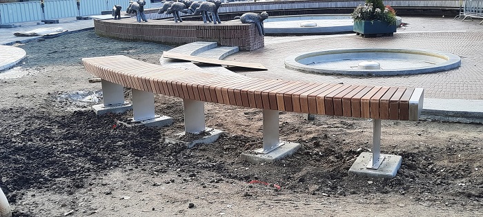 Ook de wens van eenheid in het hele gebied komt terug in en via het straatmeubilair. “Als je eraan komt lopen zie je dat in de gelijke houtposities, dat de afwerking van het hout overal gelijk is, dat je de bankpoten gelijk hebt, dat de uitstraling van de materiaalsoorten gelijk is. Het is samen één geheel. De overstekken zijn overal hetzelfde, de afwerking op de kopse kanten van de banken ook. Maar de één is recht, de ander gebogen, de één heeft een rugleuning, de ander niet, daar zitten de verschillen.”