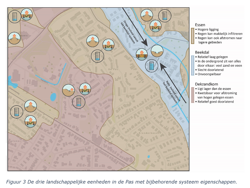 De WUR erkent dat in De Pas het vasthouden van water een flinke opgave is. Door de openbare ruimte in de essen en dekzandkommen te vergroenen kan de infiltratie worden bevorderd en een aaneengesloten groenstructuur zorgt voor de verbinding tussen de delen. Hiermee kun je het water geleidelijk naar de beekdalen leiden en zo creëer je koppelkansen voor biodiversiteit en het leefklimaat via aaneengesloten koelte eilanden.