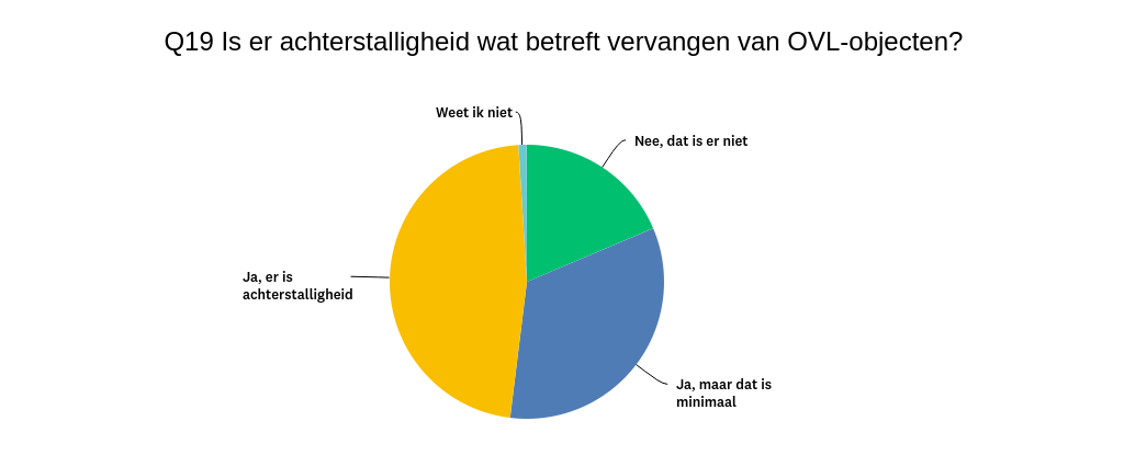 En dan de vraag of er sprake is van achterstalligheid wat betreft het vervangen van OVL-objecten. Hierop antwoordt 80 procent bevestigend. Bij 33 procent is dit minimaal, bij de overige 47 procent is het antwoord voluit ‘Ja, er is achterstalligheid’. Slechts 19 procent geeft aan dat er geen achterstalligheid is.