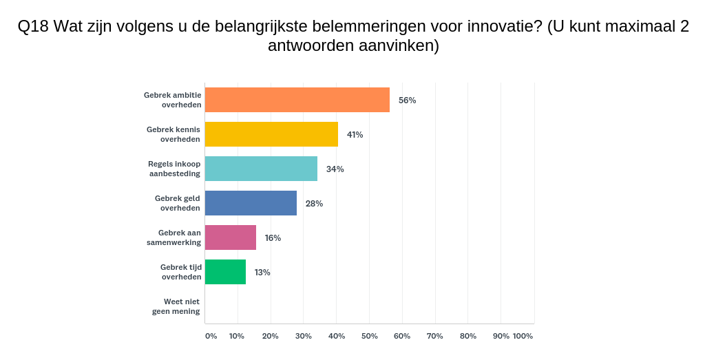 De marktpartijen zien als belangrijkste belemmeringen: gebrek aan ambitie bij de overheden (56 procent) en gebrek aan kennis bij de overheden (41 procent). De overheden denken hier heel anders over. Volgens hen zijn de belangrijkste belemmeringen gebrek aan tijd (42 procent) en gebrek aan geld (41 procent).