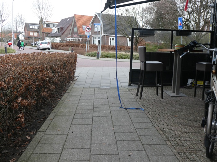 Tot slot zijn er zonweringen. Ze zijn onschuldig, functioneel, en vaak een logisch onderdeel van een winkelgevel. Tot ze te laag hangen - soms uit gemak, soms door ouderdom, soms omdat iemand niet in de gaten heeft dat ze gedurende het jaar steeds verder zijn doorgezakt. Ze worden soms ook vastgezet om te voorkomen dat de wind die eronder komt ze wegblaast (zie foto). Zo’n spanband is voor iedereen risicovol en voor slechtzienden en blinden helemaal.