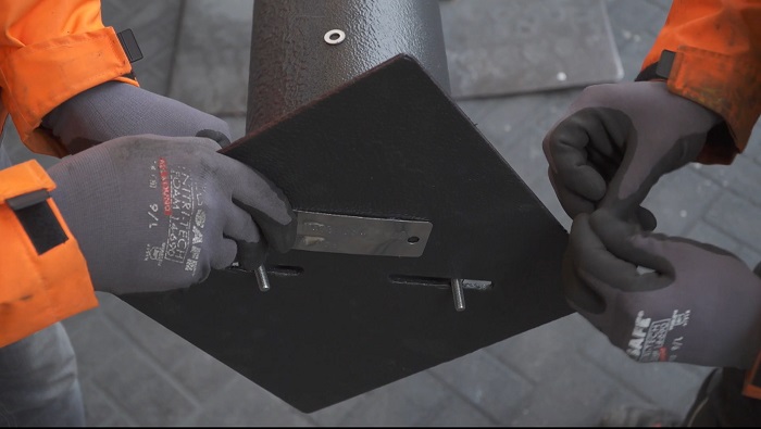 Montage van een nieuwe voetplaat bij een stalen lichtmast: onderdeel van de reconditionering voor een tweede levensduur