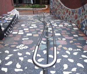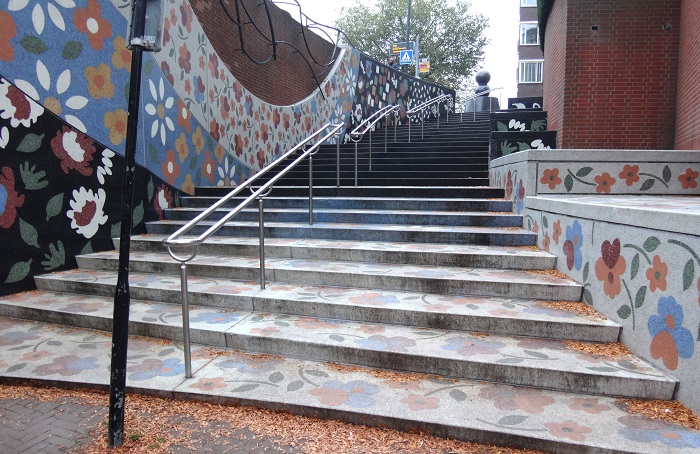 De decoratie maakt het voor de meeste gebruikers lastig om de treden te onderscheiden voor de meeste gebruikers. Voor gebruikers met een visuele beperking zijn de treden niet te onderscheiden