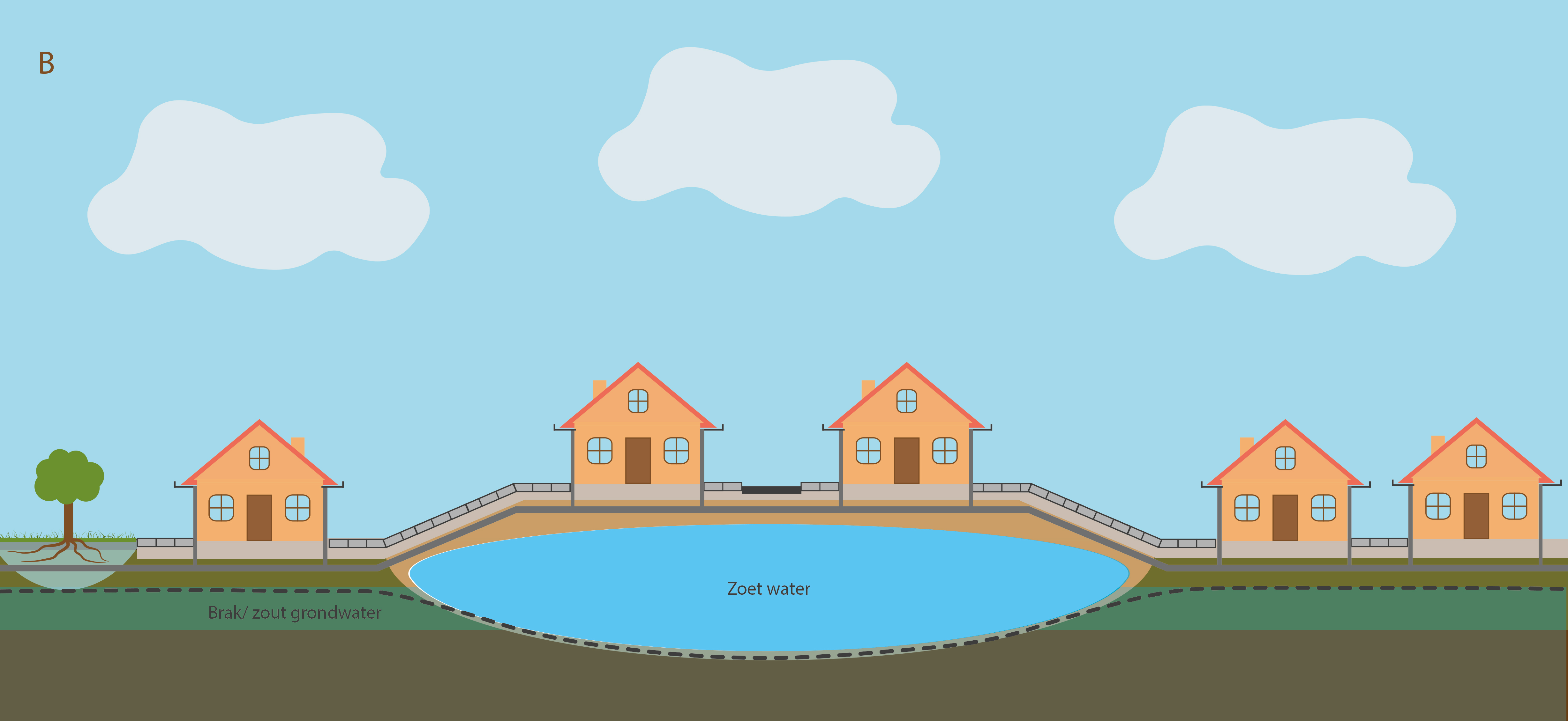 De extra berging in de zoetwaterlens voorkomt wateroverlast en zorgt tevens voor een extra zoetwater buffer in de bodem