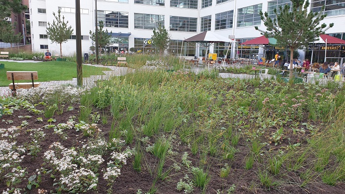 Hoe het infiltratiesysteem werkt, weet de wethouder goed uit te leggen: “Het waterinfiltratiesysteem is opgebouwd uit plastic kratten die over het parkeerdek van de garage heen gelegd zijn. Daarbovenop is een speciaal samengesteld grondsubstraat en de beplanting gekomen. De kratten houden het water vast wanneer er teveel water is, en wanneer droogte ontstaat zuigt dat zich weer naar boven toe op voor de planten en bomen.”