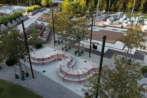 Ook hier is de Långbordet modulaire picknicktafel geïnstalleerd. Een versie met een zitting van hard gewaxt, geolied grenen en een frame van rood thermisch verzinkt staal. Duurzaamheid, ongeëvenaarde kwaliteit en veiligheid zijn kenmerkend voor dit Scandinavische straatmeubilair.