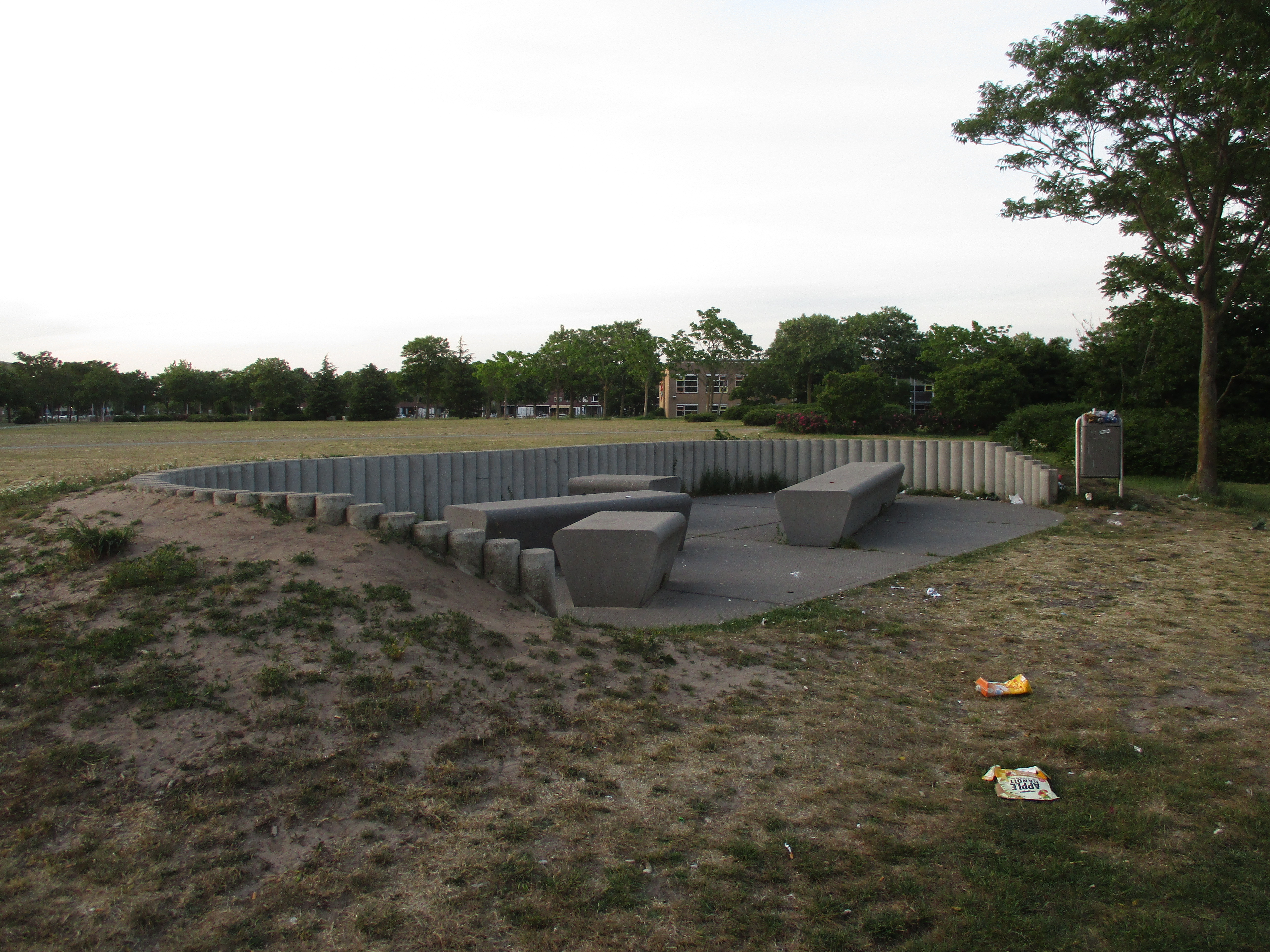 Via een robuust, driehonderd meter lang terras daal je af naar een waterpartij. Het terras leent zich bij uitstek voor een praatje en het is behalve bij hengelaars geliefd bij ganzen. Zo geliefd, dat het deel dat het dichtst bij het water ligt onbegaanbaar is door de uitwerpselen.