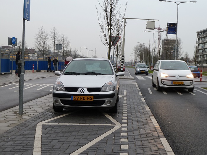 Soms is bij de inrichting van de gehandicaptenparkeerplaats gewoon niet goed nagedacht. Zoals hier in Gouda. Daar mag voor het stadhuis geparkeerd worden, wat natuurlijk heel fijn is. Echter, de parkeerplaats is gelegen aan een drukke doorgaande weg. Dat betekent dat voor het maken van de transfer uit de auto aan de bestuurderskant de rolstoeler de autodeur wijd open moet zetten op die doorgaande route en auto’s flink vaart moeten minderen of moeten stoppen zolang hij met de transfer bezig is. Niet veilig en niet fijn.
