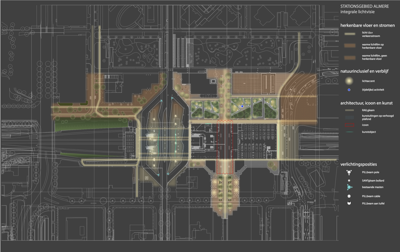 Kaart uit integrale lichtvisie Stationsgebied Almere met de samenhang en balans tussen thematiek, lichtintensiteit, kleurtemperatuur en posities van verlichting