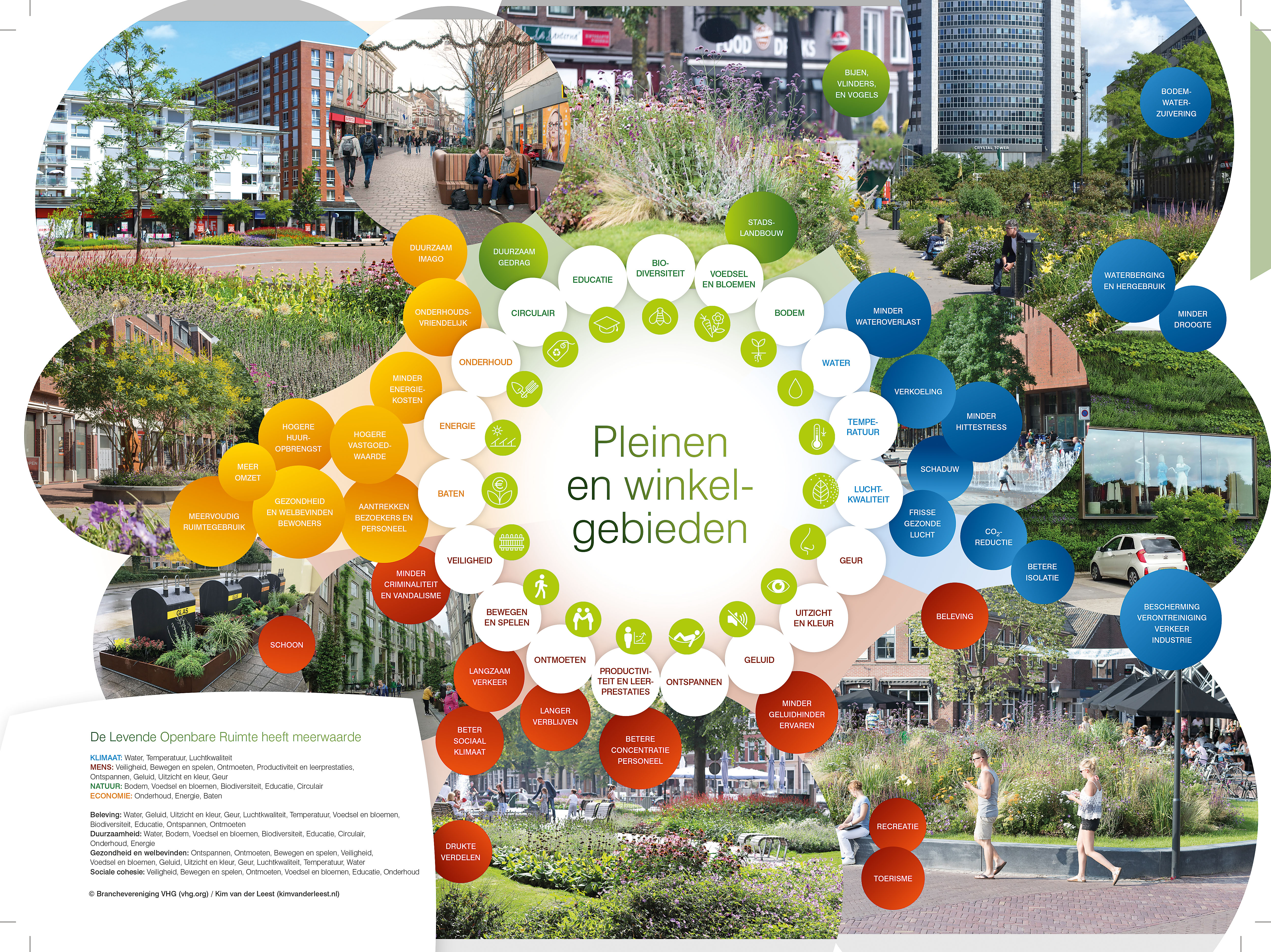Een van de hoofdstukken gaat dus over de gebiedsfunctie winkelgebieden en pleinen. De winkelbranche heeft te maken met een verschuiving naar online bestellen van producten. Dit zorgt ervoor dat beleving met bezoekers van winkelstraten en pleinen steeds belangrijker wordt. Een circulaire, duurzame en groene inrichting van het winkelgebied kan bijdragen aan een optimale beleving. Groen heeft een rustgevend effect op mensen, planten en bomen nodigen uit tot een langer verblijf en leidt tot een ander koopgedrag. Voor de horeca geldt zelfs dat meer groen ook bijdraagt aan meer omzet. Groene buitenruimten maken het mogelijk om op meer plekken aantrekkelijke terrassen te exploiteren. Veel plaatsen hebben pleinen waar bewoners en toeristen kunnen verblijven. Met groen kan een meer besloten omgeving worden gecreëerd. Zo ontstaan aantrekkelijke ontmoetingsplekken, plekken in de schaduw en kan de drukte beter over de ruimte worden verdeeld.
