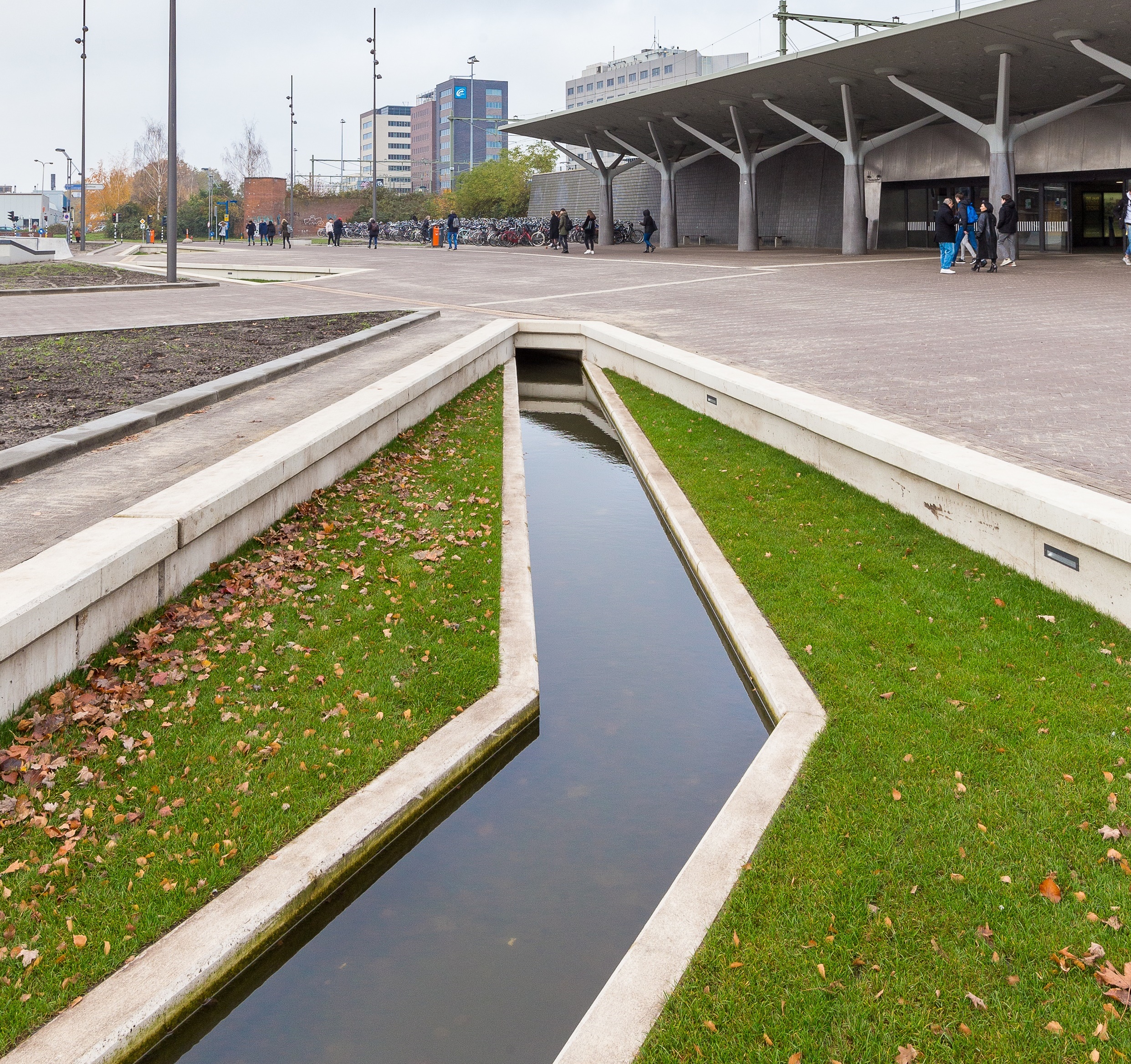 Een ander belangrijk element op het Industrieplein is de Veldbeek. Landman: “De Veldbeek is een nieuwe beek. Op het Industrieplein is de de verbinding van de Veldbeek met de Berflobeek gerealiseerd. De Veldbeek is in samenwerking met het waterschap Vechtstromen aangelegd in het kader van de klimaatactieve stad en heeft een belangrijke rol bij de afvoer van het regenwater. Dat gaat namelijk niet langer het gemengde riool in, maar wordt opgenomen in het bekenstelsel. Samen met de aanleg van groen – 38 forse bomen met onderbeplanting – zorgt de Veldbeek bovendien voor waterretentie en waterbuffering en draagt het bij aan klimaatadaptatie door het tegengaan van hittestress. Daarnaast wilden we ook graag dat de Veldbeek zichtbaar en leefbaar zou worden voor de mensen op het Industrieplein. Vandaar de zitranden en het groen naast het water.” Bijzonder onderdeel van de beek is een respectvolle verwijzing middels een monument naar de april-mei staking uit WO II, die op 29 april 1943 begon bij Stork in Hengelo en zich daarna over het land verspreidde. Het monument is een burgerinitiatief van een groep die zich De Storkiaan noemt. Zij wilden met het monument de bakermat van het uit 1868 daterende Stork in Hart van Zuid verbinden met een belangrijke historische mijlpaal. De benodigde roostergoten voor de afwatering van het regenwater naar de Veldbeek zijn gecombineerd met een cortenstalen afdekplaat met erin gestanste teksten die herinneren aan deze staking.