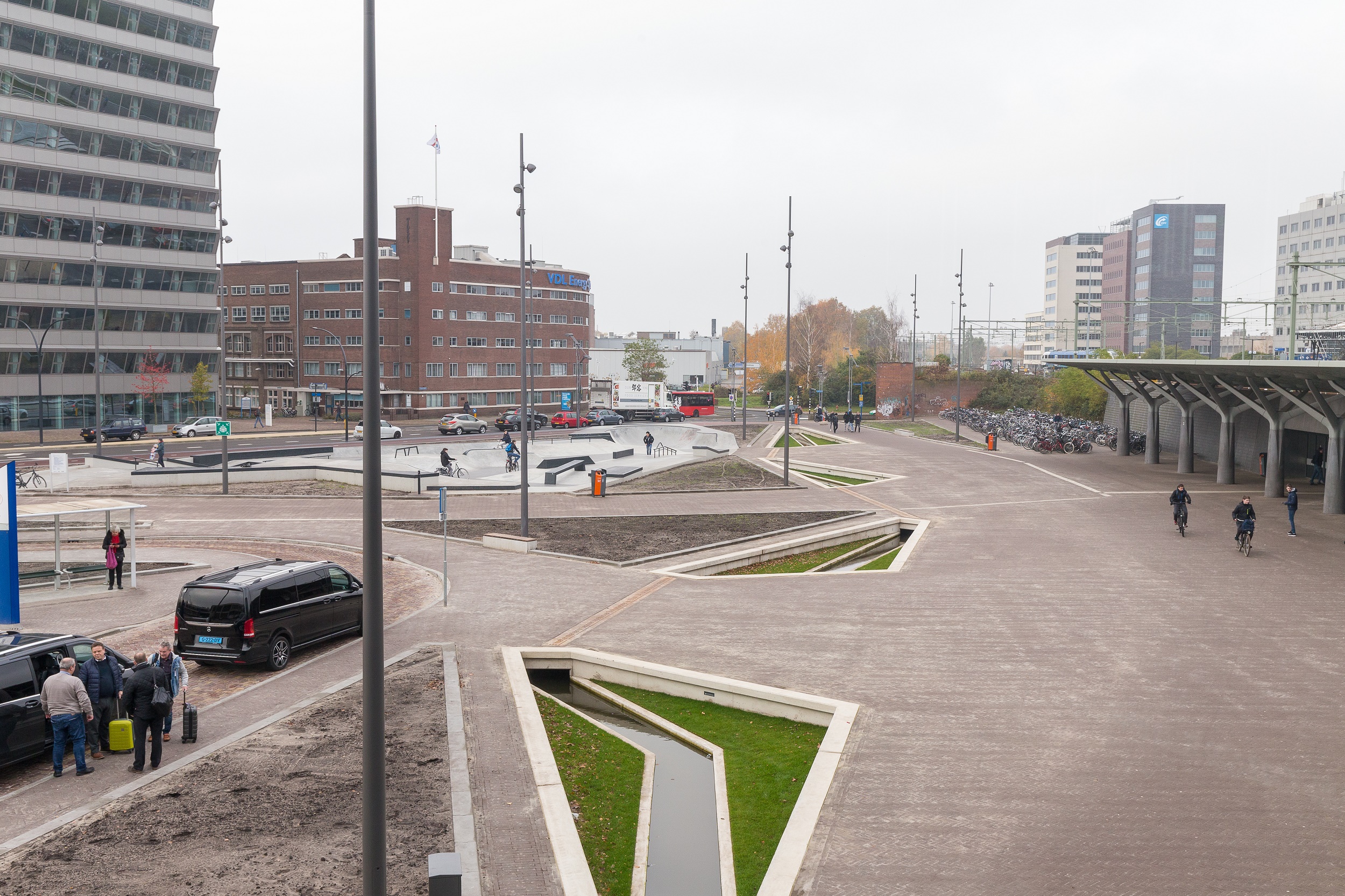 Landman vult aan: “Eind 2017 hebben we de handen van alle partijen op elkaar gekregen voor de herinrichting en kwam er, mede dankzij bijdragen van Provincie Overijssel, Waterschap Vechtstromen, Regio Twente en Pro-Rail, voldoende geld beschikbaar voor een integraal plan voor de herinrichting van het totale plein. Daarbij was de rol van NS, eigenaar van de grond, cruciaal. Zij gingen akkoord, mits het plein wel een functionele rol zou houden in de bereikbaarheid van het station. Dat betekende dat bestaande functies zoals een taxistandplaats, fietsenstallingen, Kiss & Ride parkeerplaatsen en invalideparkeerplaatsen moesten terugkeren na de herinrichting. En dat loop- en zichtlijnen van en naar het NS-station goed gewaarborgd moesten blijven. Voor ons was, naast het feit dat het Industrieplein het begin moest worden van een levendig stadsdeel, belangrijk dat het ook goed aansloot bij het WTC Business District, een internationaal kantorenmilieu dat we in de toekomst in de stationsomgeving in het Hart van Zuid willen realiseren. Op het Industrieplein hebben we daarnaast een nog ontbrekende schakel van de F35 gerealiseerd. De F35 is een fietssnelweg van 62 kilometer van Nijverdal naar de Duitse grens die ook langs het Industrieplein komt.”