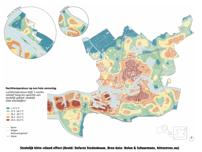 De reductie van het hitte-eiland wil Rotterdam aanpakken door het natuurlijk systeem zoveel mogelijk te herstellen, door te vergroenen met water. “We zijn heel erg bezig met ontharding waar het kan, met vergroenen. Daarvoor hebben we vanuit verschillende opgaven, ook vanuit bijvoorbeeld biodiversiteit en mobiliteit, kaartlagen over elkaar gelegd om te bepalen waar de grootste opgave om te vergroenen ligt. Die staan op de kaart en dat allemaal samen heet de Groenagenda, daar wordt deze collegeperiode aan gewerkt.”