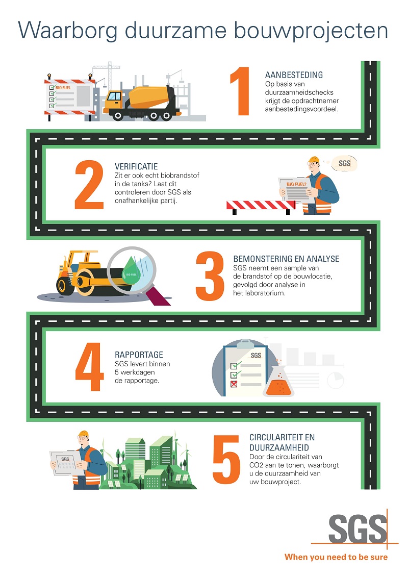 Om te verifiëren of de bouwsector daadwerkelijk gebruik maakt van groene brandstoffen, baseren gemeenten zich tot op heden op tankbonnetjes van de aannemer. SGS biedt daarentegen een betrouwbare methode om brandstof te analyseren. De monsters worden ter plaatse genomen en in het laboratorium geanalyseerd om het biogene koolstofgehalte vast te stellen.