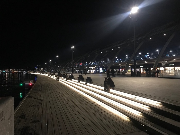 Hoewel het verlichtingssysteem dimbaar is, staat het structureel op volle sterkte. “Dat gebeurt niet per se om veiligheidsredenen”, zegt ze. “Als veiligheid de voornaamste reden was, zou de verlichting gericht zijn op de grond – niet recht vooruit. Nu overheerst een esthetisch gebaar, met lichtlijnen onder de bankjes, die weinig bijdragen aan comfort of gebruik.”