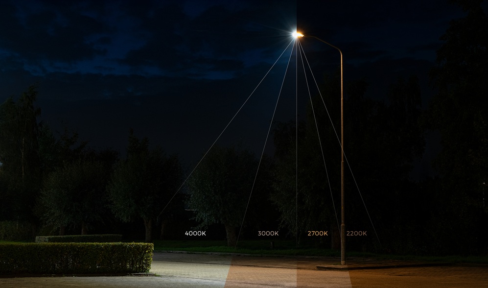 Wanneer de verlichting dimt, verandert het licht van neutraal wit (4.000Kelvin) naar warm en sfeervol licht (tot 2.200K). Bijzonder aan de proef in Twello is dat niet alleen de lichtsterkte verandert, maar ook de kleurtemperatuur. Dankzij de Tunable White Outdoor-techniek verandert de lichtkleur automatisch van helder wit naar warmer licht naarmate de verlichting dimt. Hoe werkt het? Wanneer het licht op vol vermogen brandt, is de lichtkleur neutraal wit (4000 Kelvin). Naarmate de verlichting dimt, verandert de kleur stapsgewijs naar warmer licht: