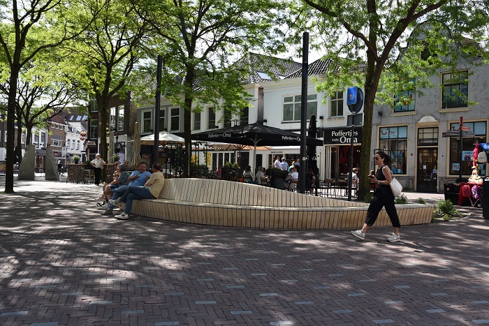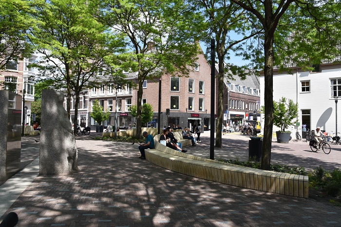De mogelijkheid om op het plein op een bank te zitten is gegroeid van vier naar vijftig meter zitoppervlak. Van Hoof: “Er stonden twee bankjes van ongeveer twee meter. Die kleine bankjes werden vooral gebruikt door dak- en thuislozen, waar mensen op een klein oppervlak niet snel naast gaan zitten. Maar nu die bank zo groot is, is er ruimte voor meer doelgroepen om er tegelijkertijd op een comfortabele manier gebruik van te maken, ook door die curven in de bank waardoor je op een andere manier naast elkaar zit dan op een rechte bank. Dus die bank brengt veel meer mensen samen zo.”
