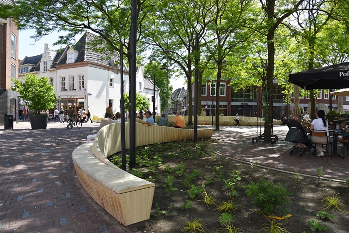 Het resultaat is een nieuwe parel aan de ketting van pleinen in de Amersfoortse binnenstad, vindt De Ligt. Eentje waar het beoogde groen, het ontmoeten en verblijven meteen in het oog springt, eigenschappen die het plein haar functie teruggeeft. “Het is nu een plein van gevel tot gevel”, vertelt Van Vliet. “Er is geen chaos meer, geen geparkeerde fietsen, je hebt veel meer overzicht en betere zichtlijnen naar de aanpalende straten. Bovendien is de bank een blikvanger, die als kompas kan werken.”