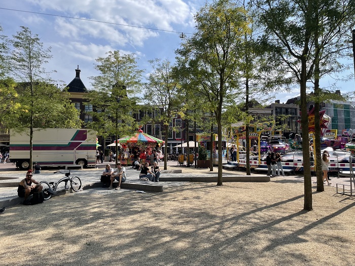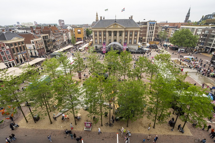 Bij klimaatadaptatie is vooral gekeken naar de hittestress. Daarbij speelden bomen een belangrijke rol. Kalfsbeek: “Tot dan toe hadden er nog nooit bomen gestaan op de Grote Markt, omdat het een marktplein was. Die zijn er nu wel gekomen. Uiteindelijk is naar een idee van het ontwerpbureau voor gekozen om de bomen bij elkaar te plaatsen in één cluster. Op die manier kon je echt een koele plek maken op het plein. Destijds werkten we met een ontwerptool die meteen liet zien wat de bomen deden met de hittestress: een reductie van twaalf tot vijftien graden.”