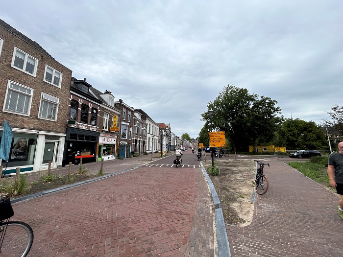 Het betekende dat inspraak en communicatie belangrijk waren. “Daarbij hebben we eerst vastgesteld dat een aantal uitgangspunten niet onderhandelbaar waren. Zo moesten er bussen over de straat rijden en die bussen moesten elkaar kunnen passeren. Dat hield in dat de breedte van de rijbaan altijd minimaal zes meter moest zijn.” De inspraak vond vanwege corona grotendeels online plaats. Dit nadeel had echter ook een voordeel: de opkomst bij de vijf digitale bijeenkomsten was hoog. “We hebben steeds een presentatie gedaan, vervolgens gingen we uit elkaar in break-outrooms. De input daarvan werd vervolgens plenair weer teruggekoppeld en verwerkt in een volgende versie. Dat leidde uiteindelijk tot het definitieve ontwerp. Belangrijke bespreekpunten in de sessies waren onder meer de breedte van het trottoir en wat te doen met de strook die uiteindelijk overblijft: alleen groen of ook fiets- en autoparkeren of terrassen. Uiteindelijk is het, niet verrassend, een combinatie geworden. Daarbij hebben we wel gepoogd zoveel mogelijk in te spelen op locatiespecifieke behoeften.”