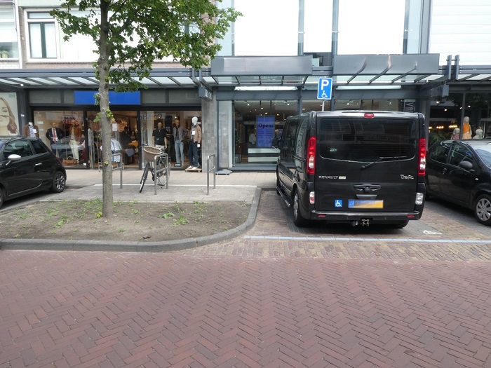 Als een gehandicaptenparkeerplaats de standaardafmeting heeft, begrijpt u natuurlijk meteen dat het voor de rolstoeler onmogelijk is om in en uit de auto te komen. En als u eens op gaat letten hoe de gehandicaptenparkeerplaatsen in uw gemeente eruitzien, dan zult u al snel ontdekken dat het té vaak parkeerplaatsen zijn met een standaardafmeting. Bijvoorbeeld zoals op deze foto, waar bovendien naast de gehandicaptenparkeerplaats een trottoir ligt met plantsoen en fietsenrekken. Geen plek om met de rolstoel om de auto heen te manoeuvreren, een transfer van de auto naar de rolstoel te maken en ook geen plek om met de rolstoel het trottoir op te gaan.