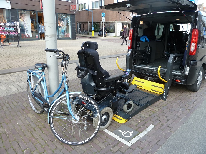 In sommige gevallen verlaat de rolstoeler de auto via de achterzijde. Daar bevindt zich dan meestal een lift om de rolstoeler in zijn of haar rolstoel uit de auto te tillen. Die auto’s zijn vaak herkenbaar aan een sticker die zich op het achterraam bevindt en waarmee gevraagd wordt tenminste drie meter ruimte achter de auto vrij te houden. Op de foto ziet u hoeveel ruimte de transfer met zo’n lift vraagt.
