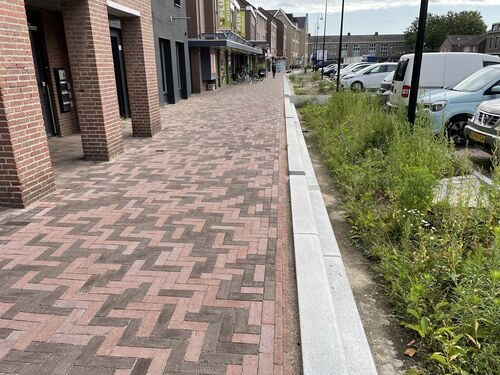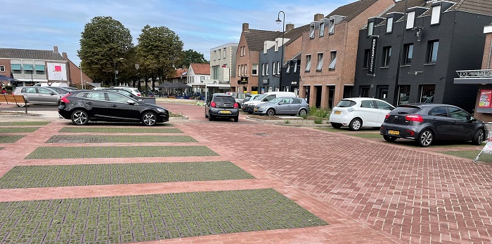 De keuze viel op twee straatbaksteentypen van Vandersanden. Voor de 144 parkeervakken werden de Greenflow® grasklinkers gebruikt. “Deze droegen bij aan de twee belangrijke klimaatadaptieve uitgangspunten: het tegengaan van hittestress en wateroverlast. Vanwege dat laatste hebben we een waterberging gerealiseerd onder het plein en de Greenflow is daarvoor uitermate geschikt omdat ze 37 procent open ruimte hebben, waardoor gras kan groeien. Groene eilanden of parkeerplaatsen dragen bij aan het tegengaan van hittestress. Tenslotte is de Greenflow ook duurzaam, omdat hij minder hoog is en er mede daardoor minder materiaal nodig is. Dit draagt ook weer een beetje bij aan de biodiversiteit. Bovendien gaan straatbakstenen 135 jaar en misschien wel langer mee en is het voor 90 procent te hergebruiken.”