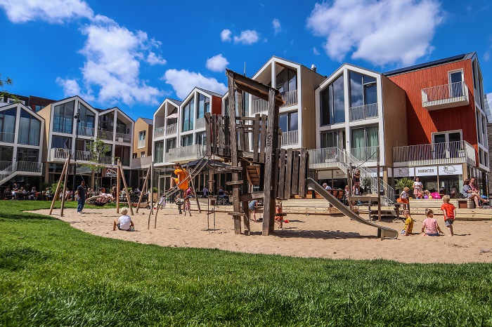 Dat was echter tijdelijk en de gemeente wilde een structurele oplossing. “Anders bleef je zitten met een lelijke achterkant en een routing die niet af was. Bovendien biedt zo’n terrein in de winter niet de kwaliteit die je op die plek zoekt. Uiteindelijk is een prijsvraag voor marktpartijen uitgeschreven. Dat heeft geleid tot een veel kleiner bouwproject met strandwoninkjes en een grotere openbare ruimte met grote speelvoorzieningen en horeca. Het is inmiddels een groot succes. Niet alleen in de zomer, maar het functioneert ook goed in de winter.”