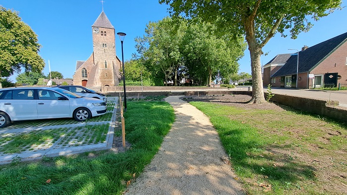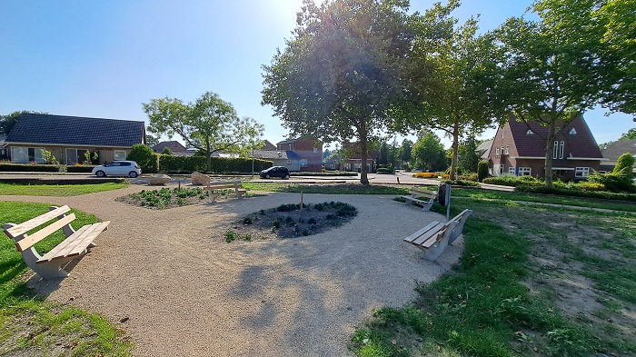 Er zijn bankjes geplaatst voor rust en ontmoeting, en de wandelpaden zijn uitgevoerd in halfverharding, zodat regenwater in de bodem kan trekken. De parkeervakken zijn uitgevoerd met groene doorgroeitegels, en de rijbaan bestaat uit gebakken klinkers die een duurzame en dorpse uitstraling geven.