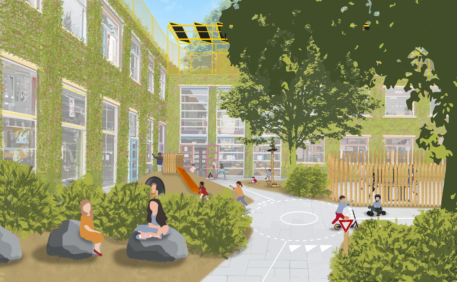 Wie door een gemiddelde Nederlandse stad wandelt, ziet het meteen: veel schoolpleinen zijn grijs, versteend en warmen snel op. Voor Eline Ranshuysen was dat aanleiding om de uitdaging aan te gaan en een schoolplein te ontwerpen waarin klimaatadaptatie en -mitigatie samenkomen. “Door vergroening en hernieuwbare energieopwekking te combineren, ontstaat een multifunctionele ruimte die niet alleen koeler is, maar ook leerzaam en uitdagend.”