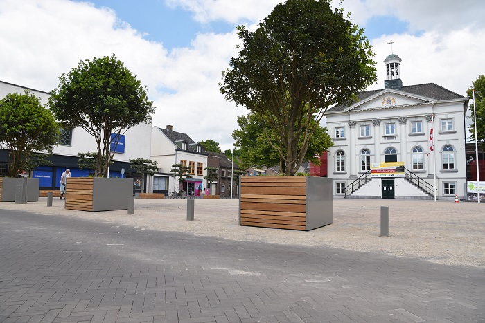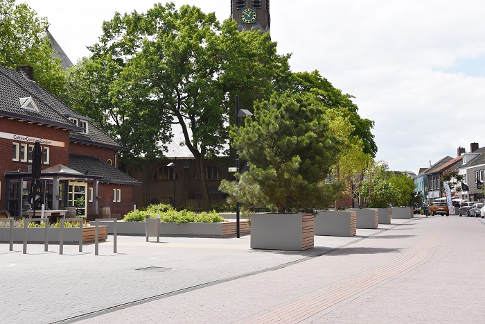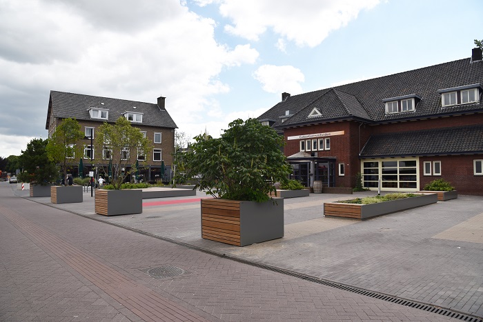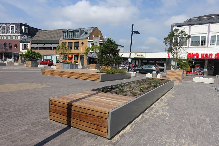 In dit geval wordt hout gecombineerd met gepoedercoat staal. Naast de boombakken zijn ook plantenbakken, zitelementen, boombanken, een podium, poefjes, picknickset, een dorpstafel, afvalbakken, fietsbeugels, afzetpalen en boomroosters geplaatst. Met name de dorpstafel is een favoriet van Ton van Beek, hetzelfde geldt voor het podium. “De bewoners hadden geen koudwatervrees, het meubilair wordt meteen heel goed gebruikt. Zo zijn er tijdens Koningsdag optredens gedaan en werd het podium onlangs nog gebruikt bij de prijsuitreiking van een sportwedstrijd.”