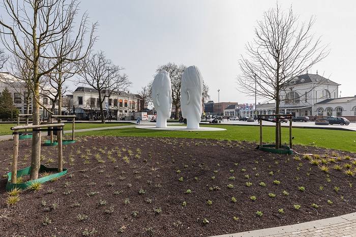 Blikvanger op het stationsplein is de mistfontein ‘Love’ van de Spaanse kunstenaar Jaume Plenza. Het kunstwerk bestaat uit twee kinderhoofden van zeven meter hoog. De kunstenaar deed naar eigen zeggen inspiratie hiervoor op toen hij ’s morgens vroeg de mistwolken zag liggen over het wijde Friese landschap. De mist is nu nog niet aanwezig, maar wordt gemaakt zodra het warmer weer wordt. ‘Love’ is een van de elf fonteinen die in de elf Friese steden – naast Leeuwarden komen er fonteinen in Sneek, IJlst, Sloten, Stavoren, Hindeloopen, Workum, Bolsward, Harlingen, Franeker en Dokkum – worden neergezet ter gelegenheid van Leeuwarden en Friesland Culturele Hoofdstad van Europa.