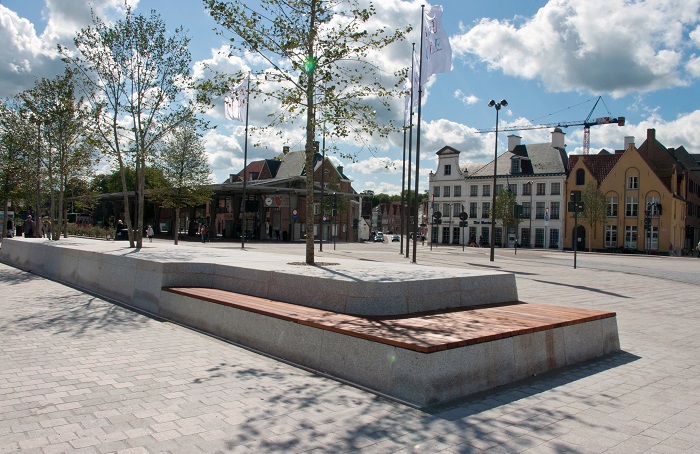 Monoliet-zitbanken in beton dienen als zitplaats en als kuip voor bomen. Ook dit aspect van de inrichting is ten behoeve van de zwakke weggebruiker.