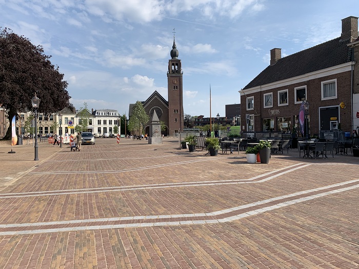 De Markt bestaat uit een groot centraal plein met aansluitend een kleiner plein waaraan voornamelijk horecazaken zijn gevestigd. “Op de Markt springt de bestrating in het oog met natuurstenen plaquettes (bronpuntradialen), opvallend straatwerk en een lijnenspel dat deels decoratief maar ook functioneel (gootlijnen) is”, vertelt Bijleveld.