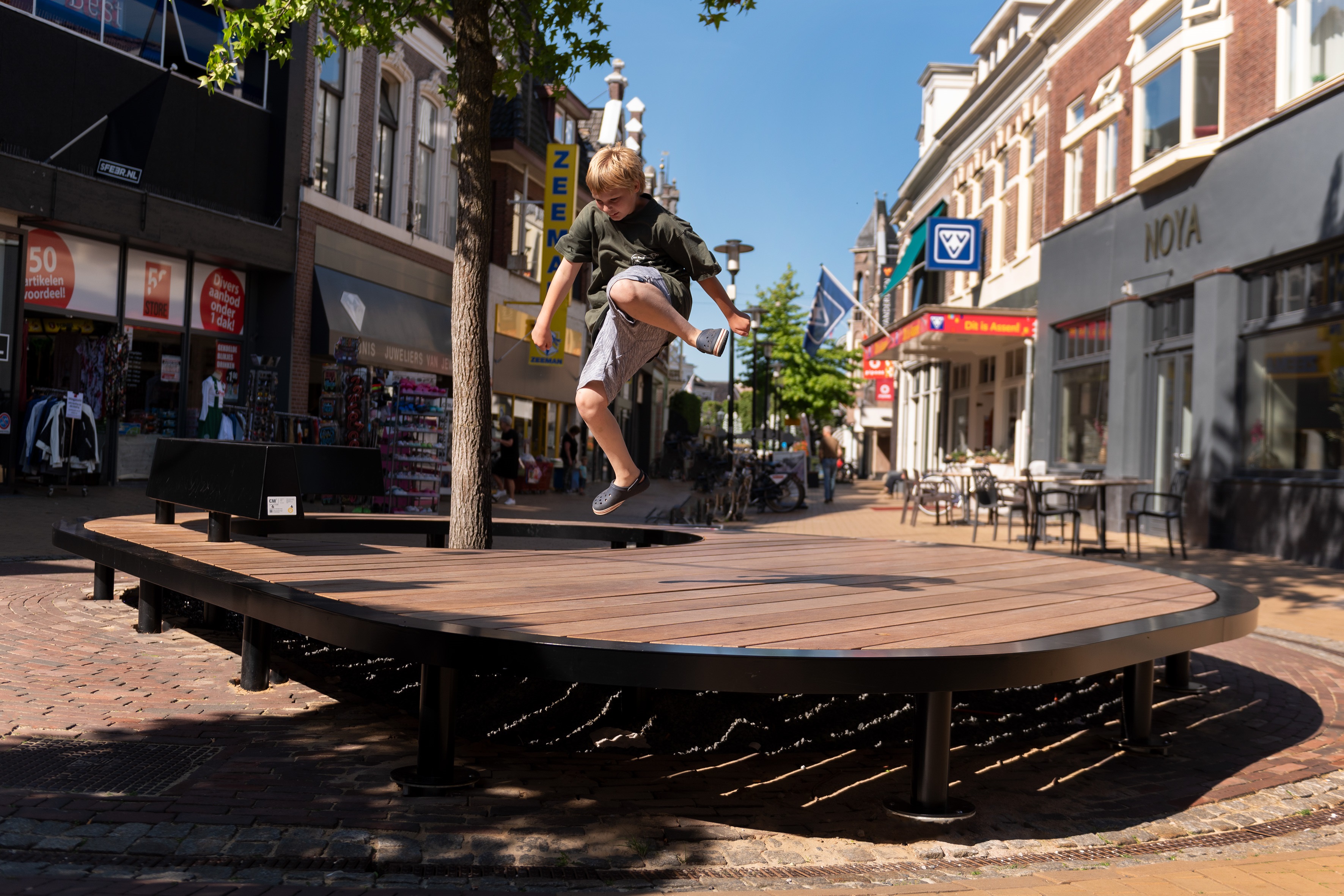Naar aanleiding van dit project werd Van Eggelen gevraagd om voor het Pompleintje een nieuwe zitbank te ontwerpen. In samenspraak met de gemeente Assen en de lokale ondernemersvereniging bedacht de ontwerper een houten zitbank van FSC Camaru en thermisch verzinkt staal. “In de steenvormige bank van 6,5 meter lang en 5,5 meter breed is een uitsparing gecreëerd voor de boom, die op warme dagen verkoeling en schaduw biedt. Ook is er deels een rugleuning aangebracht voor mensen die even rustig achterover willen leunen”, aldus Van Eggelen..jpg)