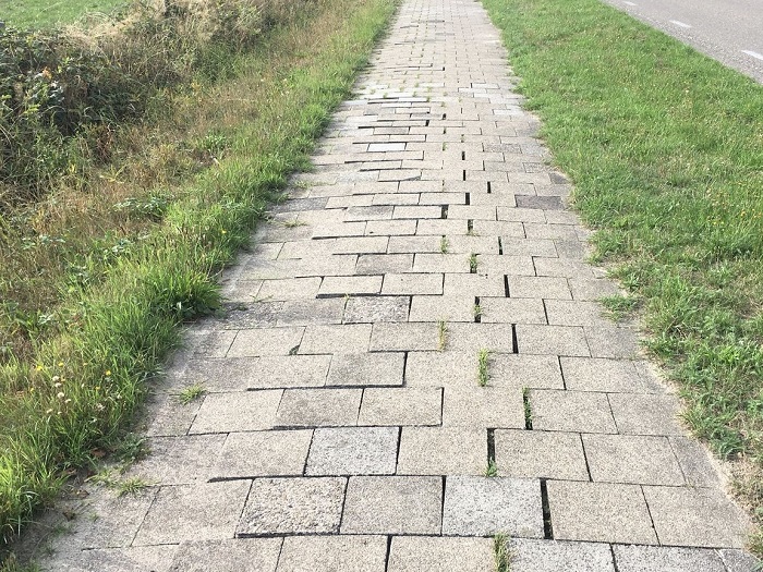 Vooral ook de betegelde fietspaden hebben niet alleen last van het omhoog gedrukt worden door de hitte, maar gaan ook los liggen. Doordat het onderliggende zand zo droog word, gaan de tegels ongelijk en uit elkaar liggen. Dit veroorzaakt gevaarlijke situaties. Zo kun je met je band vast komen te zitten of akelig ten val komen.
