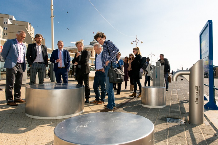 Met een feestelijke onthulling door Henk Scholten (directeur Feest aan Zee), Wim Drossaert (directeur Dunea, de initiatiefnemer van de waterpunten) en de kinderen van basisschool Het volle leven zijn drie watertappunten op de boulevard in gebruik genomen. Feest aan Zee heeft Bureau Stoep gevraagd om het ontwerp en de productie voor deze watertappunten te verzorgen.
