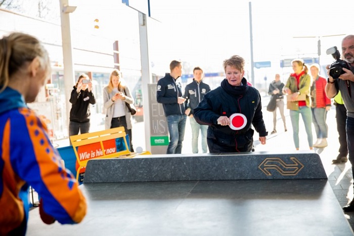 Het eerste potje pingpong werd op woensdag 27 februari om 9.45 uur gespeeld. De strijd ging tussen Nederlands bekendste tafeltennister - Bettine Vriesekoop - en NS'er Jacqueline Berghorst.