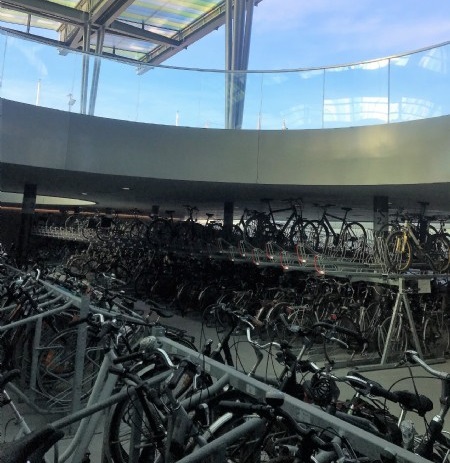 De fietsenstalling is gesitueerd in een inpandige en verdiepte ruimte en wordt overkapt door een kleurige luifelconstructie, schrijft Jan Kuipers op de website.