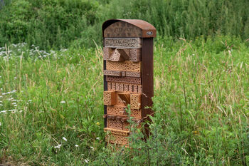 “Deze buitenruimte is niet alleen een plek waar mensen prettig kunnen verblijven, maar ook een plaats waar insecten moeten kunnen voortbestaan”, aldus Maikel te Nijenhuis van Grijsen. “Dit insectenhotel is volgens de gedachte van de circulaire economie gemaakt.”