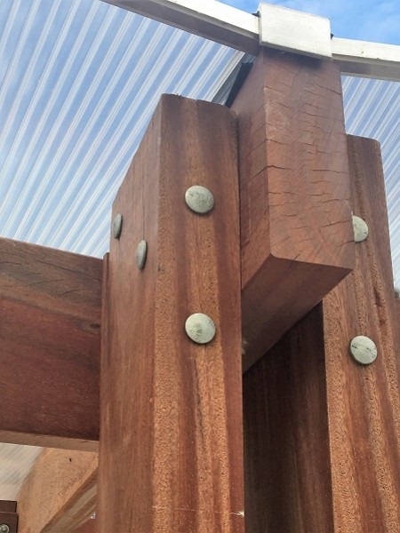 De pergola staat op het “Kunsternaarsplein”. De woningen rond dit plein zijn heel kleurrijk geschilderd. Het plein is opnieuw ingericht en autovrij gemaakt. De pergola is opgebouwd uit (FSC hout) Angelim Vermelho en geplaatst op poeren, vrij van het straatwerk. De dakbedekking bestaat uit kanaalplaten.