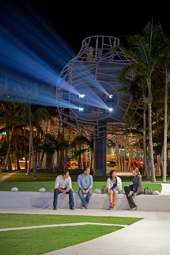 “Miami Soundscape is een bijzonder project vanuit het oogpunt van verlichting omdat de ambities destijds zeer hoog waren, zowel ten aanzien van de dag- als ook de avondbelevening. Wij ontwierpen een stadspark aanpalend aan het gebouw van de New World Symphony in Miami Beach. ’s Avonds worden er binnen concerten uitgevoerd die te bekijken en te beluisteren zijn in het park. Door een uitgebalanceerde mix van parkelementen en audiovisuele apparatuur hebben wij getracht een park te ontwerpen waarin de parkervaring niet ten koste is gegaan door de aanwezigheid van meedogenloze high tech apparatuur.”