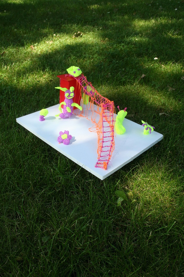 Met de schetsmodellen ben ik naar de bovenbouw gegaan. In kleine groepjes van 4 tot 6 kinderen werken zij het idee van de middenbouw verder uit. Ze moeten daarbij wel rekening houden met wat de kleuters en de middenbouw wilden. De bovenbouw maakt uiteindelijk de presentatiemodellen, onder andere van 3D-pennen, kunststofplaten en foamklei.”