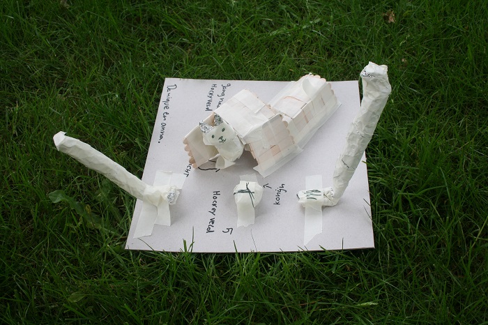 “De zoektocht begint bij de onderbouw. In kleine groepjes worden ideeën op papier gezet. Het tekenen doe ik, in samenspraak met de kleuters. De leerlingen van de middenbouw vertalen de tekeningen vervolgens naar schetsmodellen. De ideeën worden steeds concreter, maar de materialen zijn nog vrij basic: karton, aluminiumfolie, satéprikkers, ijslollystokjes en tape.