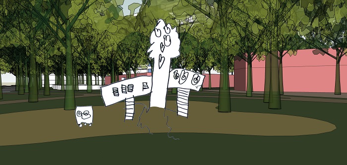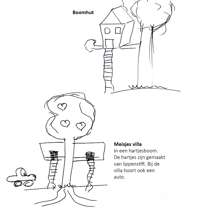 “Het viel mij op dat de kinderen graag wat doen met de bomen uit hun omgeving. Vooral het idee van een boomhut is veel genoemd. Waar het bij de kleuters vooral om het spelen gaat en de boomhut ook best een boomkasteel kan worden, gaat het bij de middenbouw en bovenbouw meer naar een clubhuis toe. In het clubhuis kan dan gedanst, gespeeld en gerelaxt worden door de kinderen.”